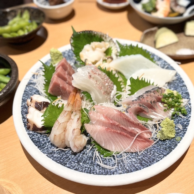 刺身の盛り合わせとろとか、貝とか、エビとか8点盛り。目でも楽しいし、ボリュームすごい。これはテンション上がるな。とろはふわーでえびはぷり。写真は2人前。たぶん5−6000円くらい。これが一番贅沢でしたね。