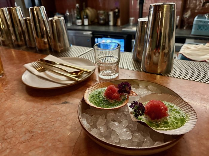前菜に頼んだホタテが、まず素晴らしかった。厚みのあるホタテ(ラディッシュクリームとディルのオイルソース)がきた。火は入っておらずおしゃれカルパッチョ的な感じ。添えられたソースとの相性が良いが、まず面構えが見たことない。おしゃれすぎる。2つで5,100円なり。ひとくち2,500円。明日帰るし良いでしょう。