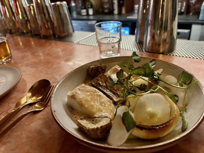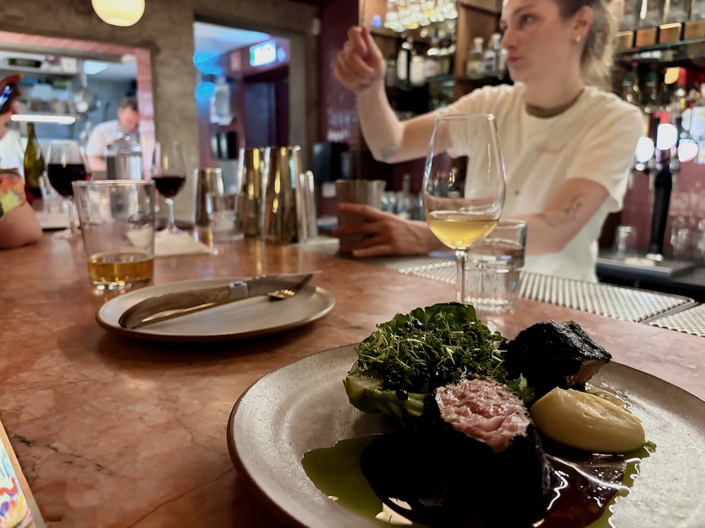 鱈のプレートは、皮目がパリッとしていて、身はしっとり。ブールブランソースということ、しつこくないのにコクがある。これは今回食べた中でいちばん感動した。白ワインが捗る!付け合わせはセロリのピューレに、足の長いブロッコリー、全て完璧な調和だった、どちらもシンプルな調理だが、素材の良さがそのまま料理の質になっていた。約4,800円なり。この食事を2人でビール3杯と白ワイン1杯で流し込んだ。