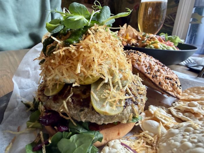 まずはアイスランドのラム肉を使ったバーガーで、肉の香りと旨味が最初の一口からはっきりわかった。臭みがまったくない。パティがしっかりと厚く、しかもパクチーを練り込んでる?ちょっとアジアンなテイストになってるのだけど、これがまたソースとのバランスも良くて、すごくいい。ラムとパクチーってあうんだ!!曲者同士と思うかもしれないけども、アイスランドのラムは全く癖がなくて、非常に食べやすい。なんなら牛よりも癖ないかもしれない。空腹も手伝ってあっという間に食べ終えた。長時間のフライトを終えた体に、肉の重さとうまさが沁みる。