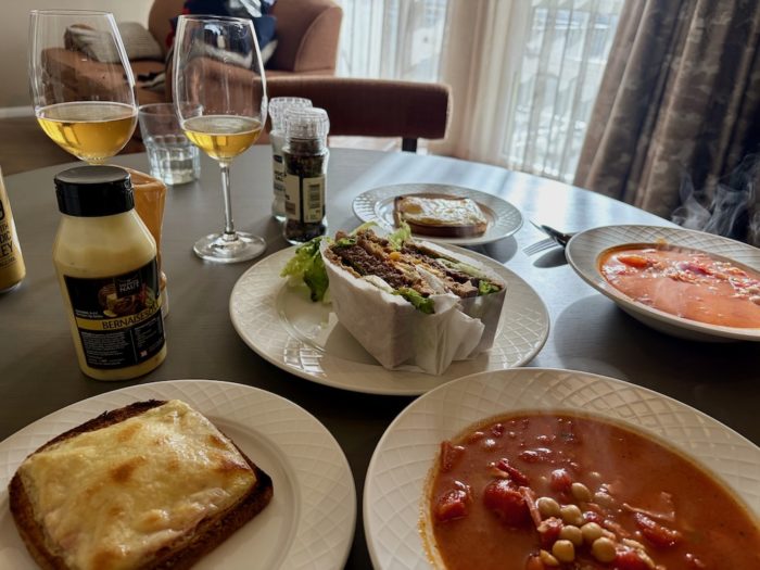 1日目夜:スーパーボーナスで買ったソーセージとスープで自炊