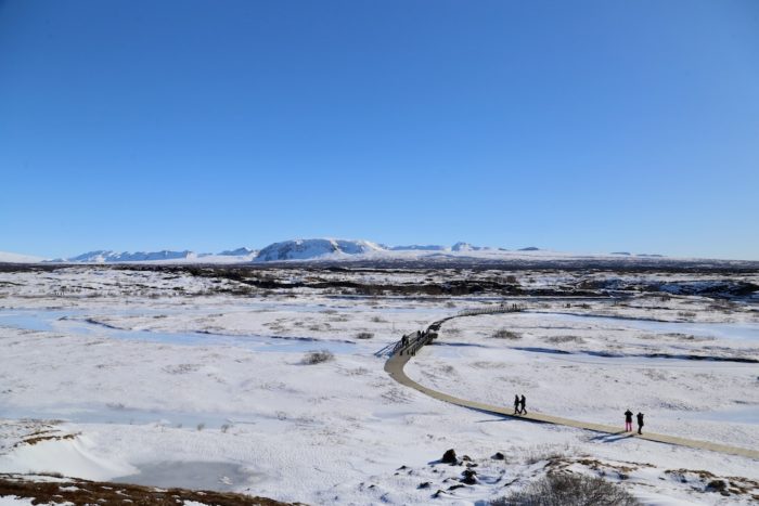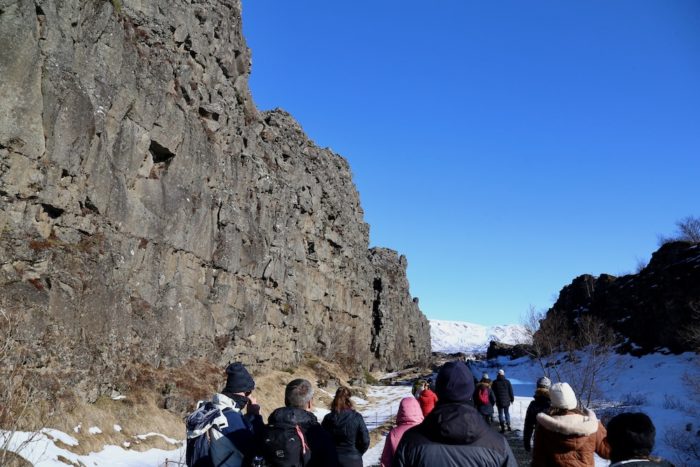 ゴールデンサークルのツアーで最初に訪れたシンクヴェトリル国立公園は、プレートの境界を地上で直接観察できる世界で数少ない場所のひとつだ。