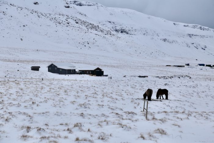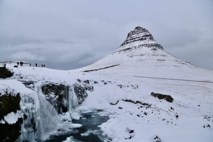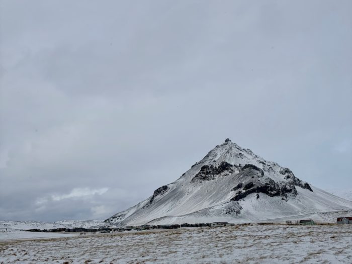 キルキュフェル山が印象に残っている。尖った三角形の山容と、手前を流れる小川の組み合わせが絵になりすぎていて、撮った写真がそのままポストカードになりそう。昨日ツアーが中止になったくらいだからこの日もとんでもない雪。基本曇りでどんより天気なのだけども、それがまたいい。個人的には晴々としたアイスランドよりも、ちょっともの寂しげな荒涼とした風景を求めていたので。