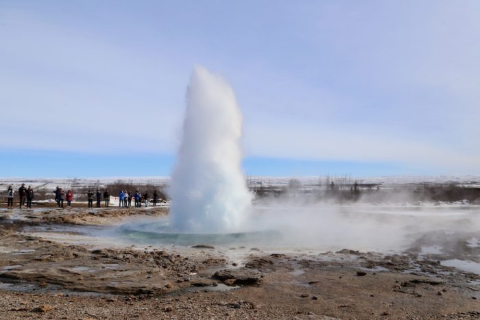 次にゲイシール間欠泉地帯へ。「ゲイシール」という言葉自体が世界中の「間欠泉」の語源になっているほどの名所で、ストロックルという間欠泉が5〜10分おきに20メートル以上の熱湯を吹き上げる。観光客が噴き上がる瞬間を狙ってカメラを構えてる。いつ噴き出すかわからないので、結構緊張。噴き出したら次の観光客に撮影場所をバトンタッチ。