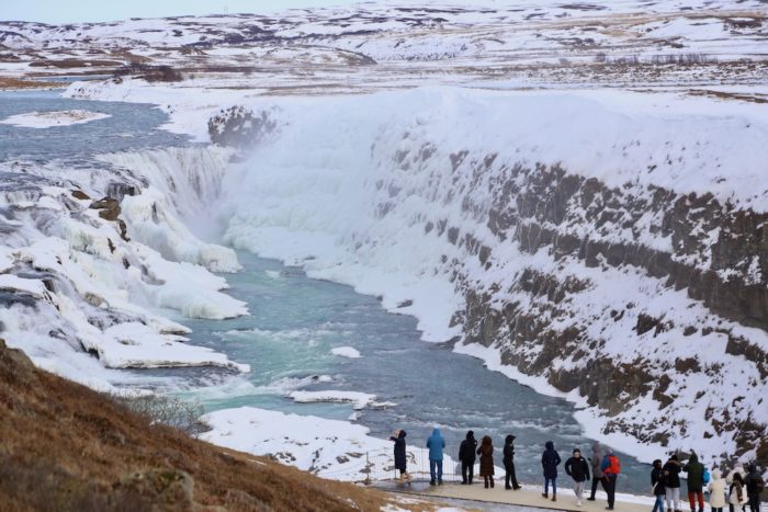 グトルフォスの滝も圧巻だった。「黄金の滝」といわれているらしく、光の角度によって滝が金色に輝いて見える瞬間があるそうだ。このタイミングでは曇っていたので、ただただ壮大な風景を見ていた。水量と落差の迫力は写真では伝わらないね。写真の限界を感じた。人間の目ってすごいんですね。実際現地で見る光景に勝るものなし。