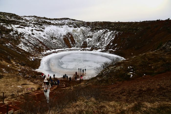 そしてこのツアーのもう一つのハイライトがケリズ火口湖。数千年前に噴火した火山の火口に水がたまってできた湖で、この時期は湖が凍っていて、すごい神秘的な風景。赤茶けた火山岩と深いターコイズブルーの氷の対比が息をのむほど美しかった。観光客が少ないこともあるみたいだけど、このタイミングはわちゃわちゃしていて、まあそれなりって感じ。でもこの風景は日本ではお目にかかれない。まあ、ここだけでなく、全部お目にかかれないわけだけど。火口の縁を一周するトレイルもあり、歩きながらいろんな角度から眺められる。