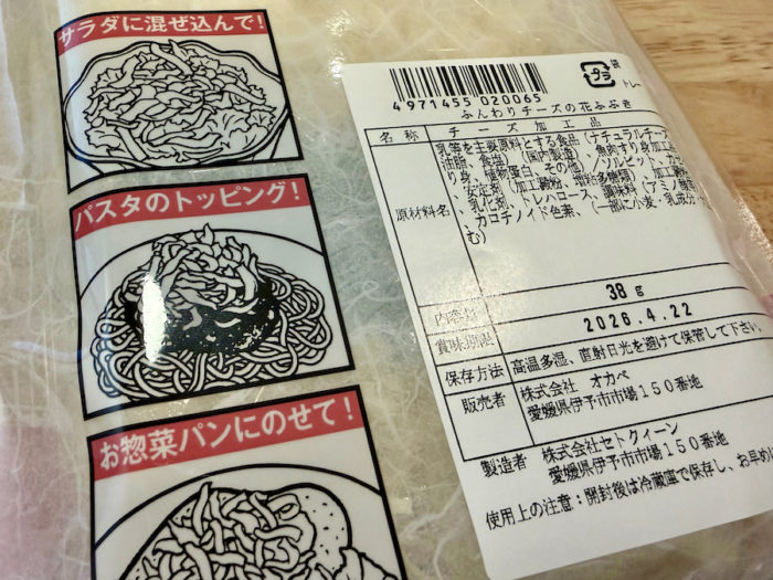 感想: まず袋を開けて感じるのはもうチーズを開封した瞬間そのもの。あれチーズだっけ?ってなる。でも口に含むとチータラが香ってくる。チータラの逆?タラチーって名前の方が合ってるかも。口の中でふわっと溶ける新食感。チーズのコクがすごい。一つずつはこんなに薄いのになんでこんなにも芳醇なのか。。。これはおつまみというか、むしろパスタとかの上にかけたいな、なんならサラダとかにも合うかも?と思ってたら、袋の裏にバッチリおすすめの食べ方として記載されていた。公式も推してくる食べ方、間違いなさそう。ただまあそのまま食べても十分に美味しいわけで、食事のトッピングにもよし、そのまま食べてもよしということで、優秀なおつまみだぜ。これは今までの物の中でもいちばん質量が軽い印象なので、気がつけば一袋無くなってたとか十分にありえる。ふんわりでさらに花ふぶき。まったくすぐになくなってしまいそうなネーミング。