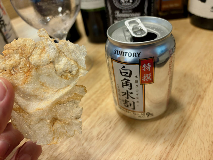 ペアリング: こんなに一つに絞るのが難しいペアリングもない。だってなんにでも合うんだから。ビールは当然合う(かっぱえびせんとビール最高ですよね?)。でもそれで終わらせるのは勿体無い。白ワインももちろんあう。でもやはりそれじゃあ面白くないしな。ということであえて、バーテンダーっぽくウイスキーで考えてみる。ウイスキーの場合、ジャパニーズのしかも少し上品な、、、サントリーオールドなどが良さそうだ、あれの水割りかな、リザーブがあれば至高だろう(ローヤルっや山崎とかではないかな、味が強い)。これらの水割りはあう気がする。ひとまず、家にあった白角水割りの缶で合わせてみる(なんでこんな酒が家にあるのか)。やはり!これが!!合う!!!間違いないこれはジャパニーズがいい。しかも白角水割りは完璧な調合で有名な缶ウイスキー。おつまみを引き立てる仕事としてはかなり優秀な立ち位置にいることは間違いない。家には角瓶があるお家もそこそこあると思うから、その場合はいつもの割合で作るソーダではなく気持ち薄めの水割りで作って飲んでもらいたい。消去法とかいいながらきっちりウイスキー推してしまっておる。。。ならばということで、お気に入りの米焼酎大石でも挑戦してみたところこれまた、鼻からの海老の香り抜け最高に良い。大石(熟成)は少しウイスキーな雰囲気もするので、海老の香ばしさと結構相性が良い。ウイスキーと焼酎の間って感じのお酒とも言える。繰り返し言うけど、マジで何にでも合う。スコッチだって合うと思う(バーボンよりスコッチかな)、その場合ハイボールにしたタリスカーとかがちょうど良いと思う、やはり潮の風を感じる、そして少しスパイシーな胡椒の香りがするお酒。なんならタリスカーソーダ割りに黒胡椒を少し入れてみて。公式の飲み方だしこのエビの風味には抜群に合うはず。スコッチならこれかなあ。