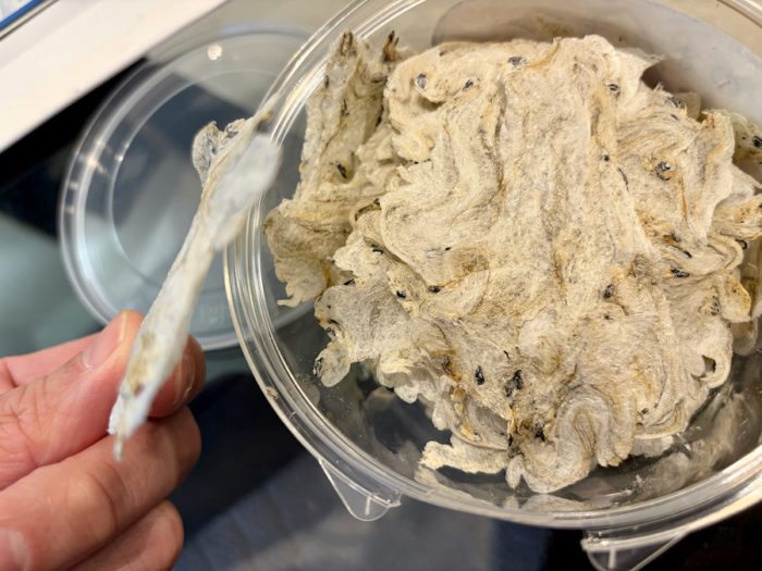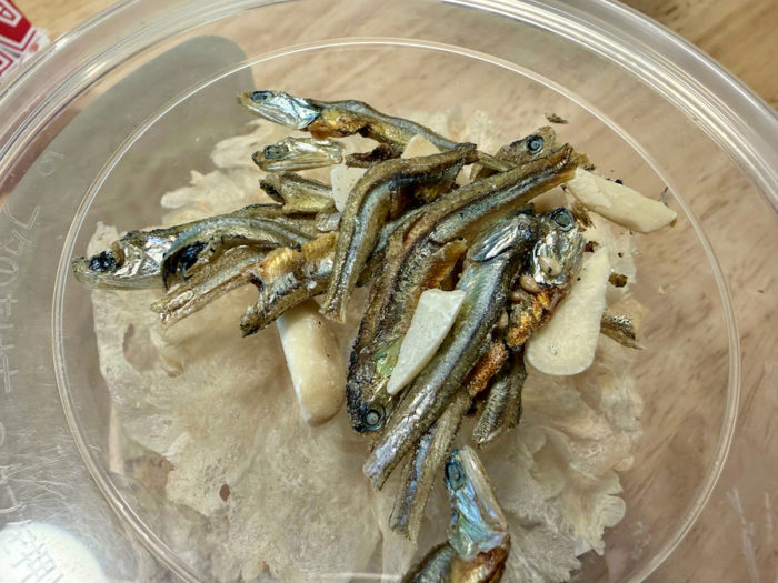 感想: 1つ目はちりめん。なんかこれら全ての原点って雰囲気があったので。まーじで薄い。ほんとに赤ちゃんを触る様に、気をつけて掴まないと、すぐに割れてしまいそうな薄さ。注意深く口元に持っていきまして、パリッ。とした瞬間に瀬戸内の海の香りが広がるー!。しかもパリっていってもとにかく薄いのでこれまでに聞いたことのないパリッと音。ちりめんは、まだ生まれたばかりのシラスを茹でて、乾燥させたもの。大人になってからのイワシとは違って苦味はほとんどなく、噛むほどに上品な身の甘み、旨みがじわじわと拡がってきます。海そのものの塩気と、淡白ながらも清涼感のある味わいで、後味も最高だ!うまいぞー!!注意点というかより美味しく食べるために、さらっと飲み込むのではなく、いつもの3倍くらいは口の中で噛み続けるのがよい。とんでもない魚の旨みに口の中が初めての体験します。